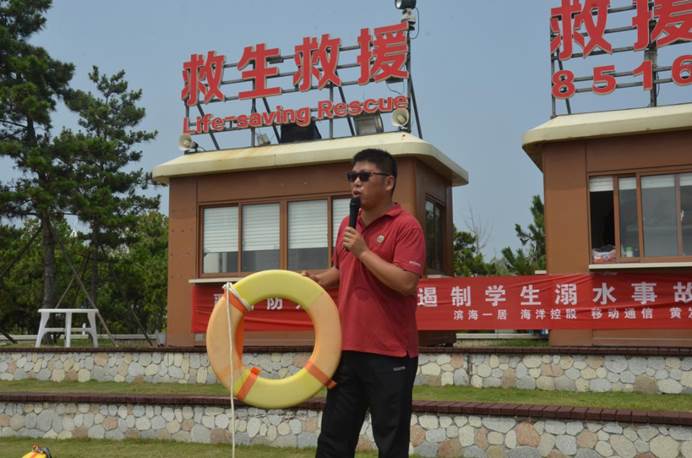 黃發集團旅游公司副總經理傅元彩講解浴場現場游玩注意事項